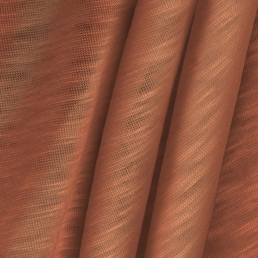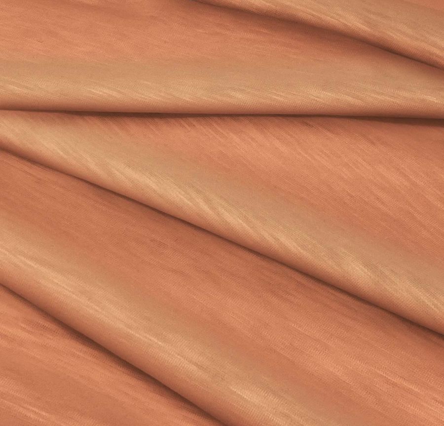 Cabe destacar que este tejido está impreso con el color liso a una sola cara por impresión digital textil, lo que significa que el diseño solo se encuentra en una de las caras del tejido. Las características generales de la tela base son su textura lisa, su tacto suave y elástico, así como su transparencia jaspeada, que le confiere un efecto visual muy atractivo. Estas características se combinan con las del color naranja cinabrio para ofrecer un tejido impactante y llamativo, ideal para prendas de moda tanto de hombre como de mujer, especialmente para camisetas, ya que se trata de un tejido atemporal.