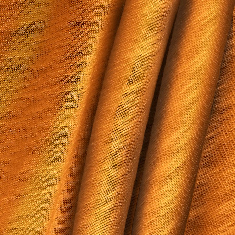 La tela base es el Punto Camiseta Jaspeado – Dubái, un tejido de punto compuesto por 100% poliéster con un gramaje de 135 gr/m2 y un ancho de 160 cm. El color liso impreso es Naranja-Gamba, con un CMYK de 2 61 91 0 y tecnología de impresión por sublimación. Este color combina bien con tonos terrosos y marrones.