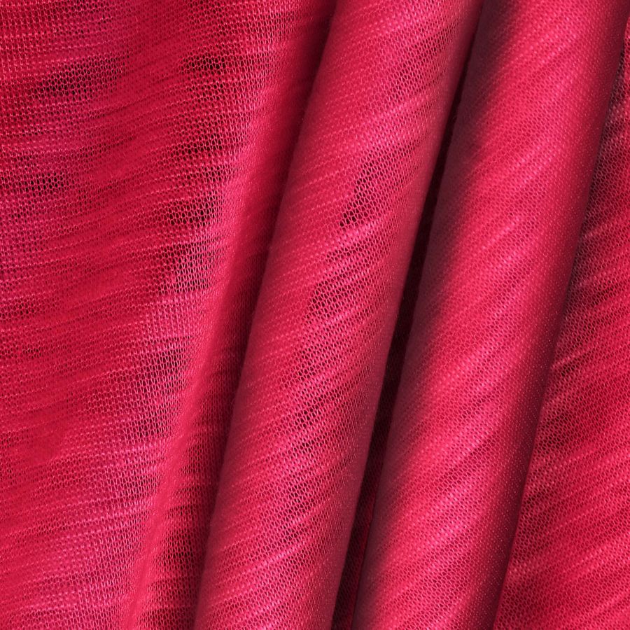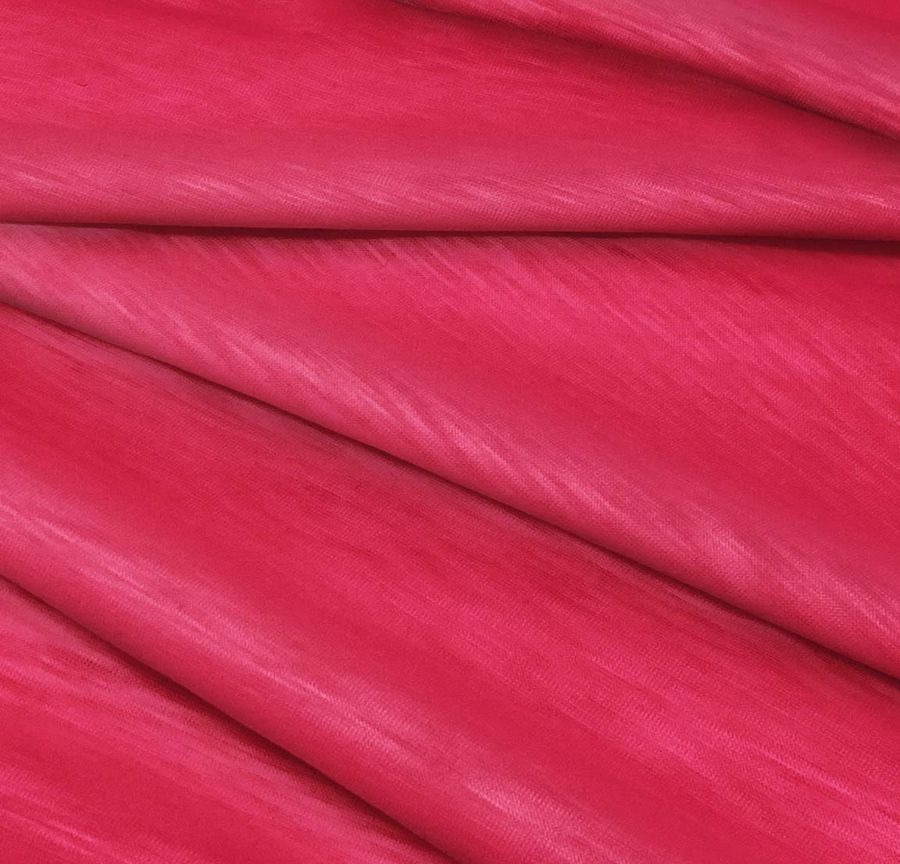 La tela base de este tejido es el Punto Camiseta Jaspeado-Dubái, una tela de punto compuesta por 100% poliéster, con un gramaje de 135 gr/m2 y un ancho de 160 cm. Su color liso impreso es Rojo Amaranto, el cual tiene los siguientes atributos de color según el CMYK: 5 96 73 1. El color secundario es un tono magenta intenso que simboliza la pasión y la energía, combinando perfectamente con tonos cálidos y fríos como azules, amarillos y verdes.