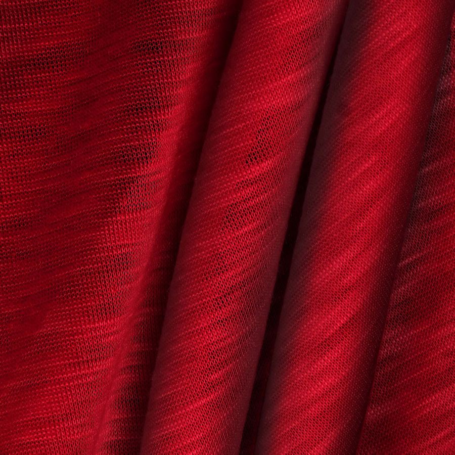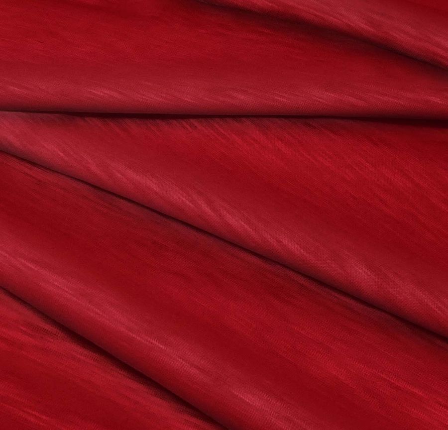 El tejido base es el Punto Camiseta Jaspeado - Dubái, una tela de punto compuesta al 100% de poliéster, con un gramaje de 135 gr/m2 y un ancho de 160 cm. El color liso impreso es un Rojo Diablo intenso, obtenido a través de la tecnología de sublimación con valores CMYK de 28 100 94 36, lo que se traduce en un alto porcentaje de magenta y amarillo. El color secundario de este tono es un rojo intenso y oscuro, que evoca la pasión y la energía. Combina en particular con tonos neutros como el blanco y el negro, así como con tonos dorados y naranjas.