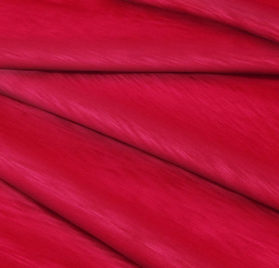 La tela base de este tejido es el Punto Camiseta Jaspeado - Dubái, compuesta por 100% poliéster, con un gramaje de 135 gr/m2 y un ancho de 160 cm. El color liso impreso es de un rojo escarlata Gobelinos, con un CMYK de 18 100 77 8. El color secundario de este tejido es un jaspeado visual traslúcido que simboliza la fuerza y la vitalidad. Combina perfectamente con tonalidades de rojo, naranja y amarillo para crear un efecto sorprendente y elegante. Esta tela está impresa con el color liso a una sola cara por impresión digital textil, lo que significa que no es un tejido tintado, sino impreso.