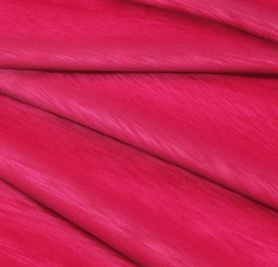 La tela base, Punto Camiseta Jaspeado - Dubái, es una tela de punto compuesta de 100% poliéster, con un gramaje de 135 gr/m2 y un ancho de 160 cm. El color liso impreso en este tejido es rojo frambuesa, con una tinta cyan de 0, una tinta magenta de 96, una tinta yellow de 53 y una tinta black de 0. El CMYK del color liso es de 0 96 53 0. Este color es una mezcla vibrante de tonos rojos y magentas, que evoca energía, pasión y creatividad. Combina particularmente bien con tonos neutros como el blanco, el negro y el gris.