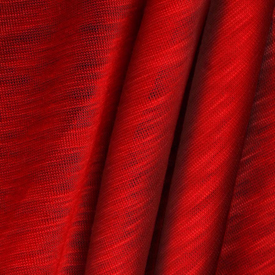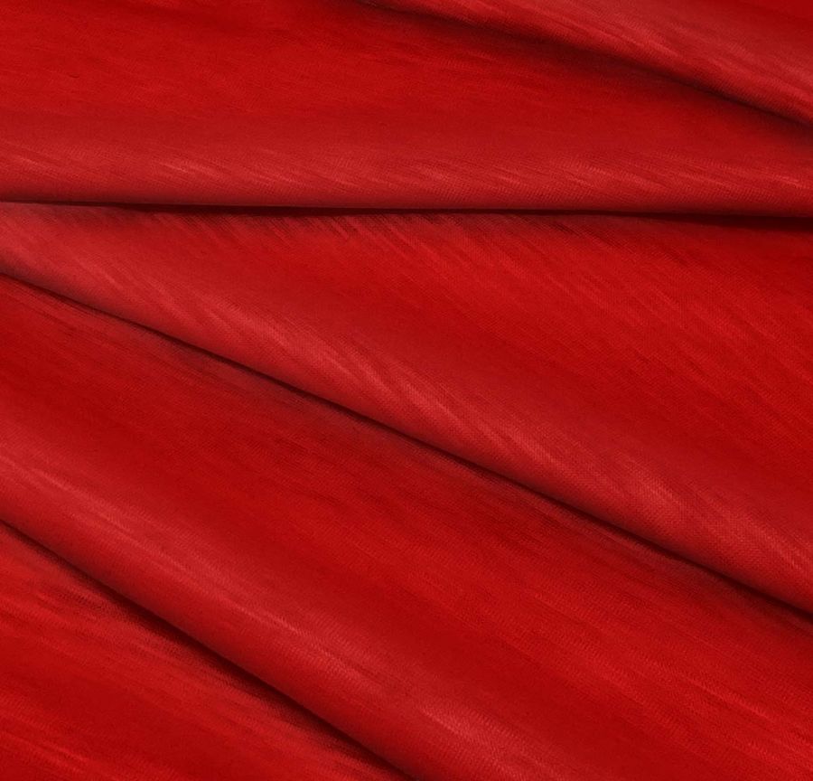 La tela base es el Punto Camiseta Jaspeado - Dubái, una tela de punto 100% poliéster con un gramaje de 135 gr/m2 y un ancho de 160 cm. El color liso impreso es rojo caramelo oscuro, con un CMYK de 22 100 100 20. Este color secundario simboliza la pasión y la energía, y técnicamente se caracteriza por sus altos valores de magenta y amarillo, y un bajo valor de negro. Combina particularmente bien con tonos neutros, como gris y blanco, así como con tonos cálidos, como naranja y amarillo.