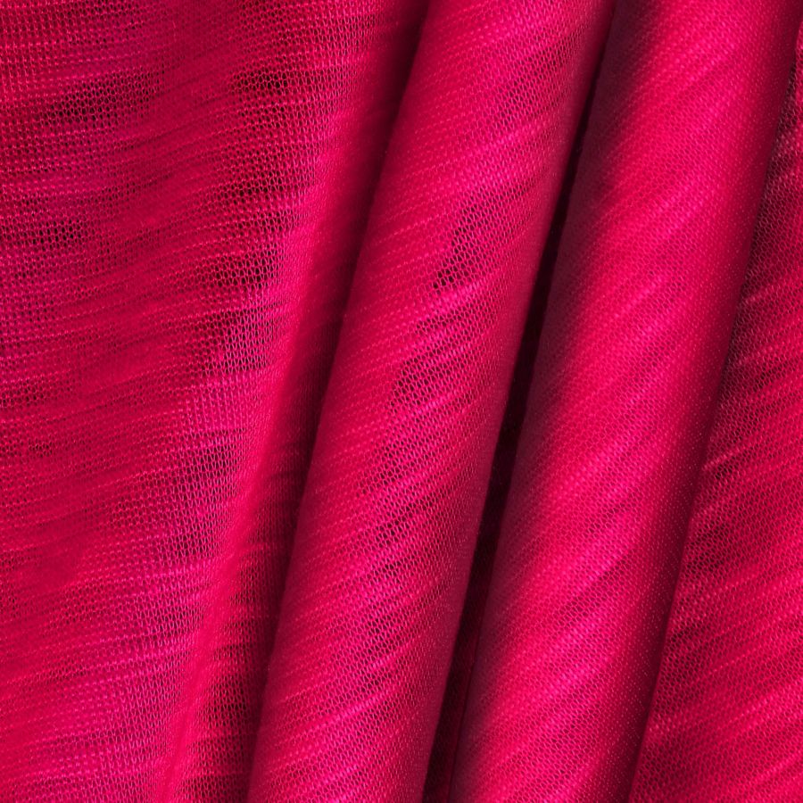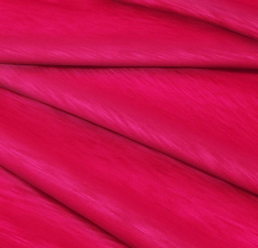 En definitiva, el Punto Camiseta Jaspeado - Dubái en su color liso impreso rojo purpúreo es una tela de poliéster elástica y suave, con una textura visual que combina transparencia y jaspeado. Es adecuada para moda de mujer y hombre, en particular para prendas de punto y camisetas, y se puede combinar especialmente con tonos neutros y más claros. Su tecnología de impresión es la sublimación en poliéster y requiere cuidados específicos para su mantenimiento.