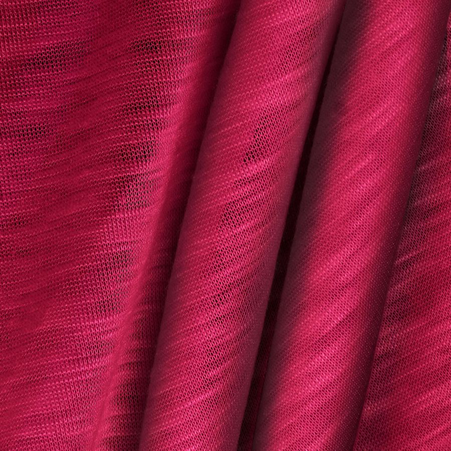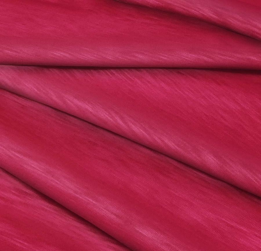 La tela base es la Punto Camiseta Jaspeado - Dubái, una tela de punto compuesta completamente de poliéster con un gramaje de 135 gr/m2 y un ancho de 160 cm. El color liso impreso en esta tela es un Rojo Vino Francés, que se caracteriza por un CMYK de 22 98 56 16. Este color es una tonalidad profunda que simboliza la pasión, la energía y el amor, y que combina especialmente bien con otros colores como el blanco, el negro, el oro y el plateado.