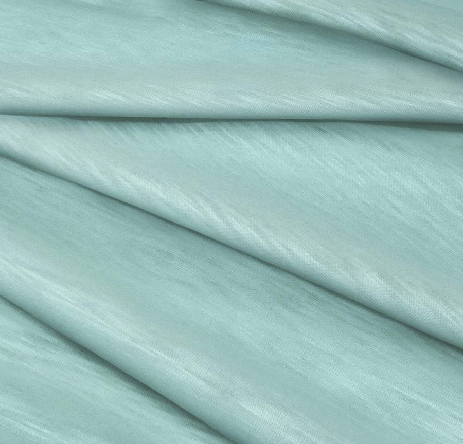 La tela base de la camiseta es Punto Camiseta Jaspeado - Dubái y su color liso impreso es de un verde aguamarina claro con un CMYK de 42 0 22 0. Este color se podría describir como fresco, ligero y lleno de vitalidad, pues evoca los tonos del mar Caribe y de la naturaleza tropical. Además de combinar muy bien con tonos grises, azul oscuro, beige y blanco, el verde aguamarina hace un efecto muy interesante con tonos naranjas, fucsias y rojos, creando contrastes significativos.