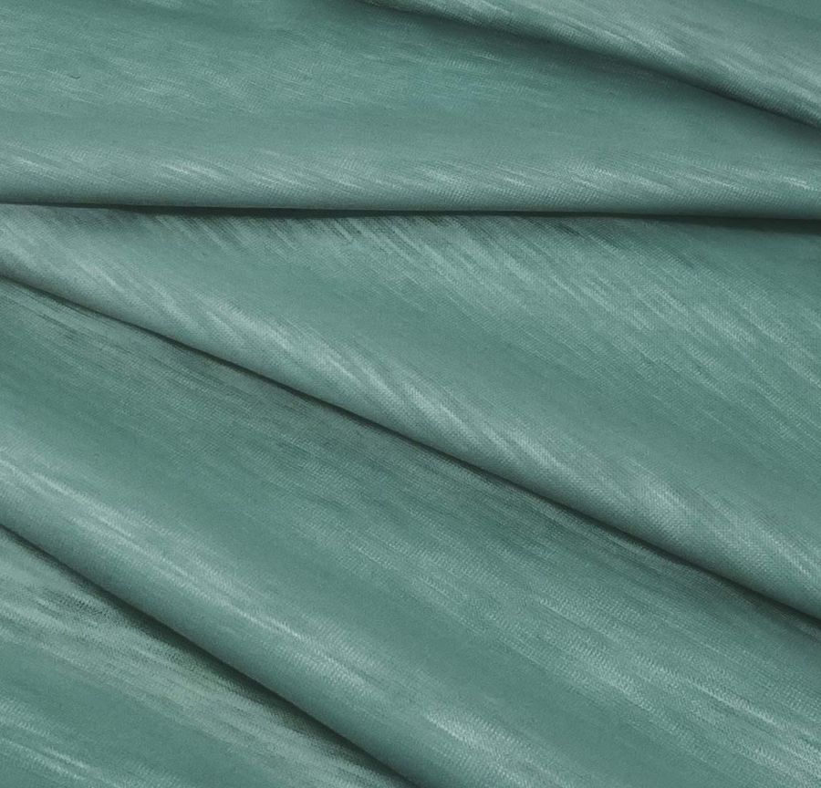 La tela está impresa con el color liso a una sola cara por impresión digital textil, lo que significa que el color se aplica solo en el lado exterior de la tela. La textura de la tela es lisa y visualmente translúcida y jaspeada. Tiene un tacto elástico y, en general, es muy versátil para su uso en prendas de punto de moda para hombres y mujeres como camisetas.
