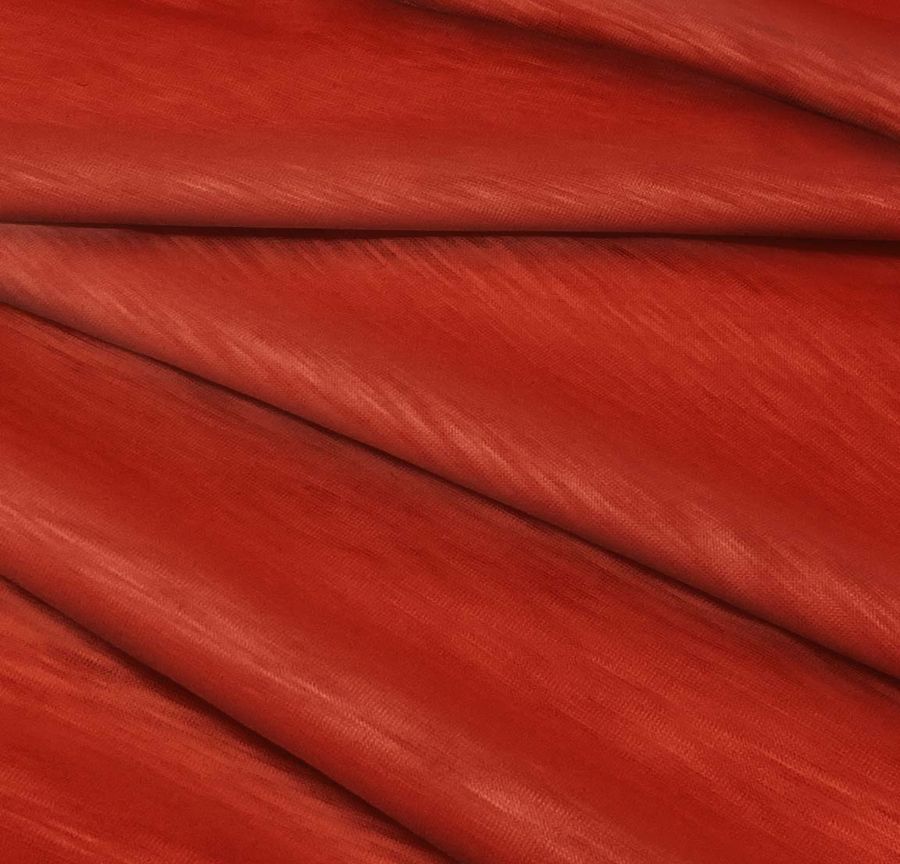 El tejido está impreso en una sola cara mediante impresión digital textil, lo que significa que el color rojo tomate queda impreso únicamente en la superficie de la tela base, y no permea a través de ella. Además, la tela posee varias características que la hacen especialmente destacable, como su textura lisa, visual translucida y jaspeada, y su tacto elástico.