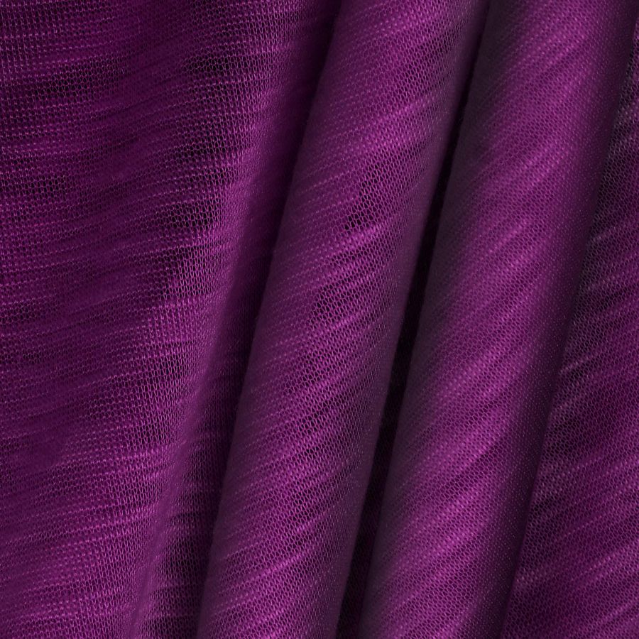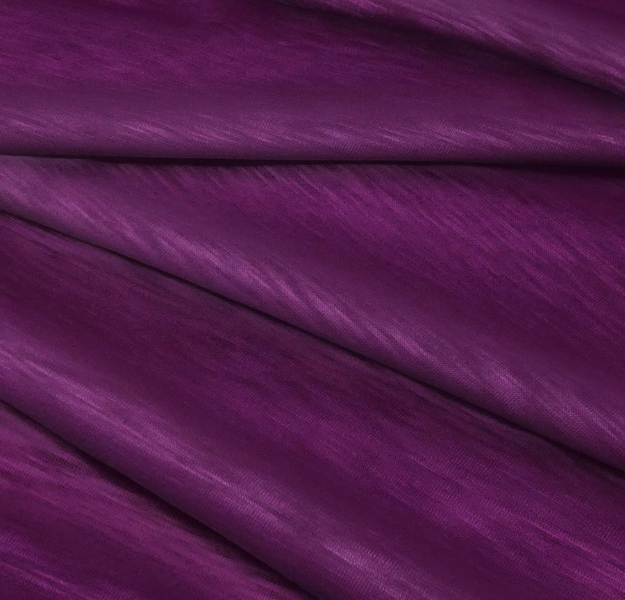La tela base es Punto Camiseta Jaspeado - Dubái, una tela de punto compuesta al 100% de poliéster con un gramaje de 135 gr/m2 y un ancho de 160 cm. Su color liso impreso es Morado/Ciruela morada, cuyo CMYK es 70 100 33 40, y presenta una textura jaspeada y translúcida. Este color secundario combina en particular con blancos, grises, rosas y verdes claros. La tela está impresa con el color liso a una sola cara por impresión digital textil, lo que implica que no es un tejido tintado sino impreso.