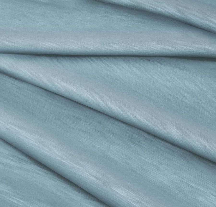 En cuanto a las características generales de la tela, presenta una textura lisa y visual translúcida, con jaspeados en su superficie que le aportan un toque de originalidad. Además, cuenta con una elasticidad que le permite adaptarse perfectamente al cuerpo. En lo que respecta al color liso impreso, el azul grisáceo es un color sofisticado y elegante que combina perfectamente con una amplia gama de colores, como el blanco, negro, gris, burdeos, verde oscuro y beige, entre otros.