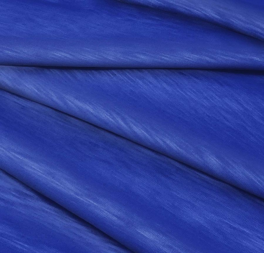 La tela base es Punto Camiseta Jaspeado - Dubái, compuesta por 100% poliéster, con un gramaje de 135 gr/m2 y un ancho de 160 cm. El color liso impreso en la tela es Azul Klein, cuyo CMYK es 96 82 0 0. Este tono es vibrante e intenso, con una mezcla de cian y magenta perfectamente balanceados. Combina a la perfección con tonos neutros como el gris, el blanco y el negro.