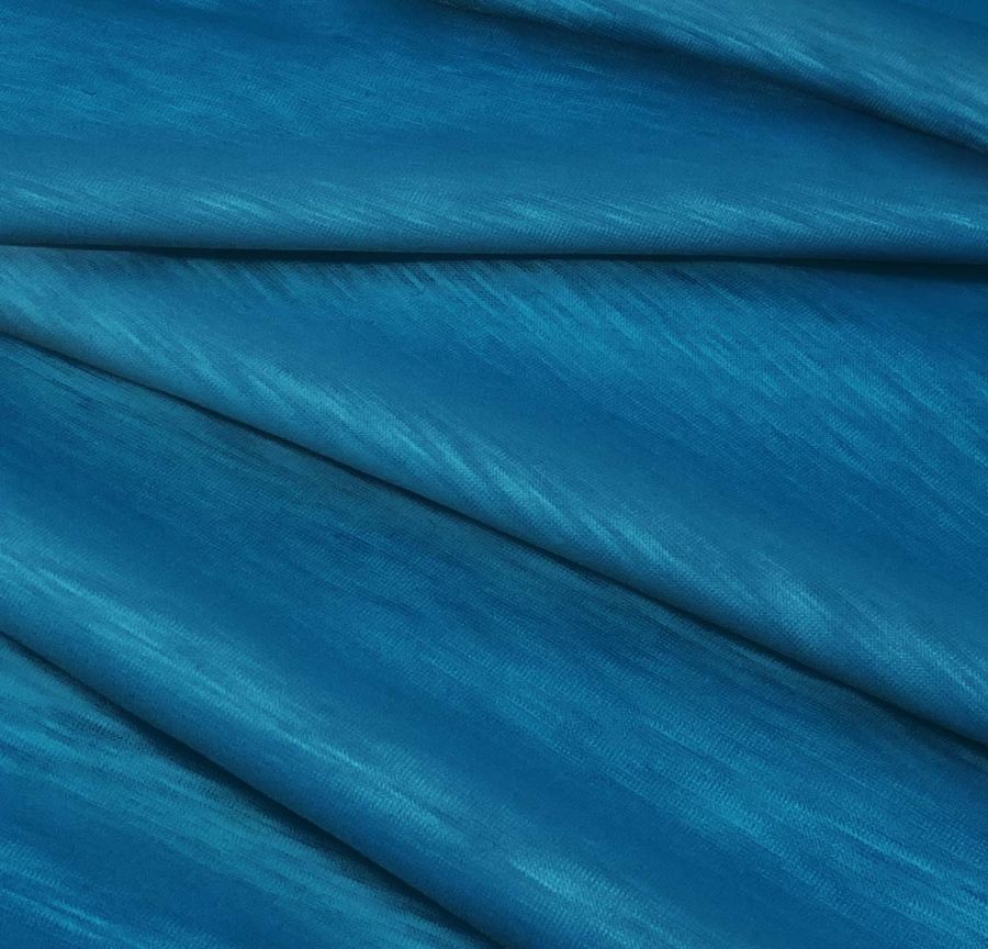 Hay que destacar que la tela base está impresa con el color liso a una sola cara por impresión digital textil, lo que significa que el tejido no está tintado, sino que presenta una impresión a todo color en una sola de sus caras. La textura de la tela es lisa al tacto y visualmente presenta un acabado translúcido, jaspeado y elástico.