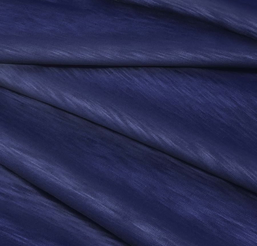 La tela base, Punto Camiseta Jaspeado - Dubái, es una tela de punto compuesta al 100% de poliéster con un gramaje de 135 gr/m2 y un ancho de 160 cm. Su color liso impreso es azul nocturno con una tinta cyan del 98, magenta del 90, yellow del 36 y black del 36. El CMYK del color es de 98 90 36 36. Este color liso se caracteriza por su profundidad y oscuridad, con matices azules ligeramente violetas. Combina especialmente bien con tonos neutros como el gris antracita o el negro, pero también con otros tonos más vivos como el amarillo o el naranja.