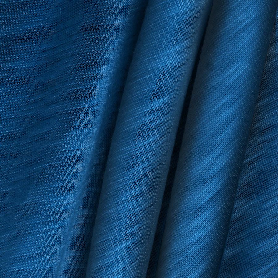 La tela base es la Punto Camiseta Jaspeado - Dubái, una tela de punto de 100% poliéster, con un gramaje de 135 gr/m2 y un ancho de 160 cm. El color liso impreso es un azul seda, con un CMYK de 98 71 31 17. Este color se caracteriza por ser un tono fresco y luminoso, que transmite serenidad. Además, combina muy bien con tonos como el blanco, gris, negro y rosa palo.