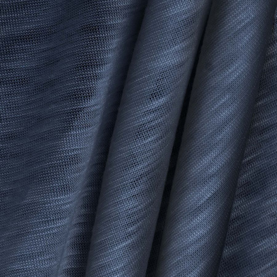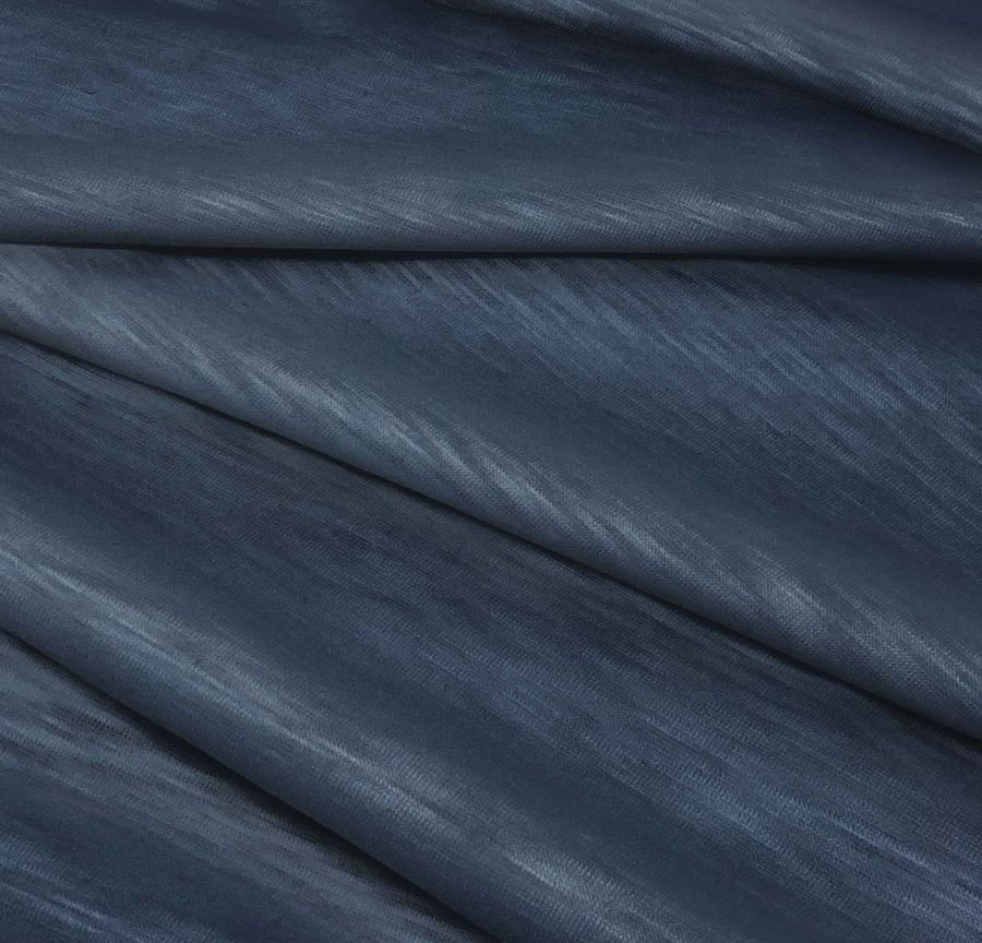 La tela base Punto Camiseta Jaspeado - Dubái presenta un tono liso Azul Denim Oscuro, obtenido mediante la combinación de tintas en CMYK: 82 de cian, 66 de magenta, 44 de amarillo y 42 de negro. Representa un color versátil que simboliza la confianza y la libertad, combinando a la perfección con tonos neutros, blanco y marrones tierra. Cabe destacar que la tela está impresa con el color liso a una sola cara por impresión digital textil, lo que implica que no se trata de un tejido tintado y que no presenta color en el reverso.