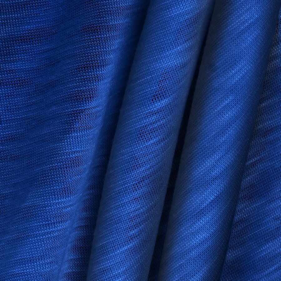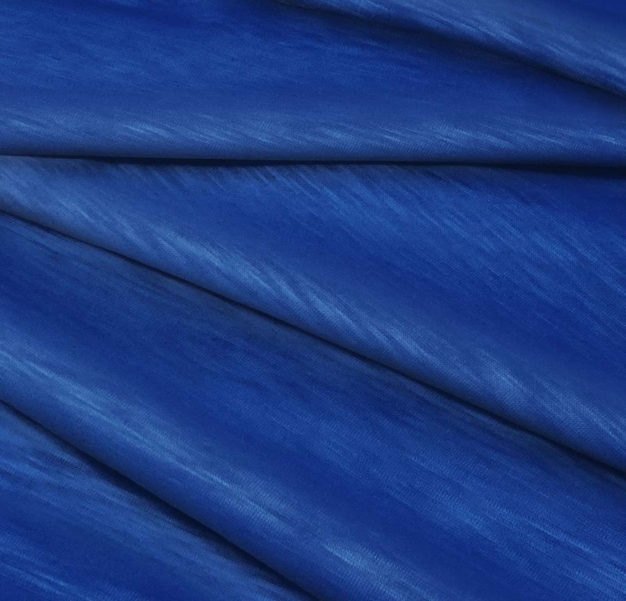 La tela base de esta prenda es el Punto Camiseta Jaspeado - Dubái, una tela de punto con una composición 100% poliéster, un gramaje de 135 gr/m2 y un ancho de 160 cm. El color liso impreso tiene la tonalidad Azul Xenón, con un CMYK de 100, 84, 22, 5. Este color se puede considerar un tono intermedio entre azul y turquesa, logrando una sensación de frescura y vitalidad en la prenda. Combina perfectamente con tonos más sobrios como el blanco o el negro, así como con otros tonos de azul o incluso con rosados fuertes.