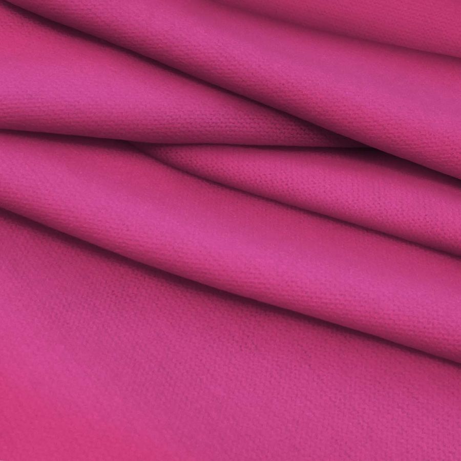 La tela base es el Punto Jersey de Tacto Algodón - Atenas, con una composición de 81% poliéster, 15% acrílico y 4% elastano. Su gramaje es de 239 gr/m2 y su ancho es de 150 cm. El color liso impreso es Rojo Fresa, con un CMYK de 7 87 20 0. El color secundario del Rojo Fresa es un rosa intenso, que combina particularmente bien con colores oscuros como el negro y el azul marino. El tejido está impreso con el color liso a una sola cara por impresión digital textil.