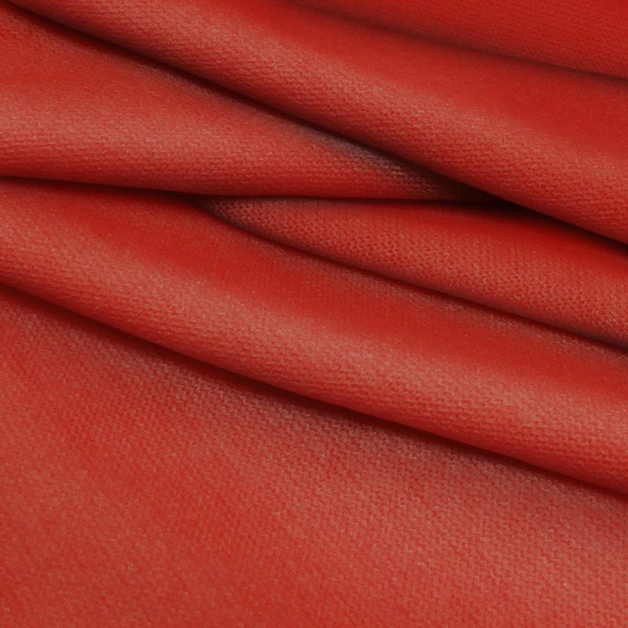 La tela base es un Punto Jersey de Tacto Algodón - Atenas, compuesta por 81% de poliéster, 15% acrílico y 4% elastano. De color liso impreso en rojo ladrillo refractario, cuyo contenido de CMYK es 23-97-100-19. Este color simboliza la pasión y la intensidad, transmitiendo energía y vitalidad. Además, combina perfectamente con tonos grises, negros y azules, creando un look moderno y sofisticado.