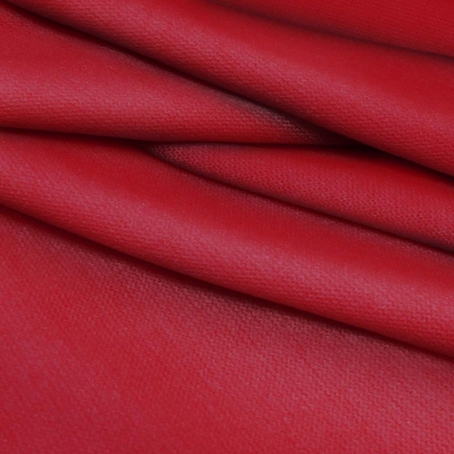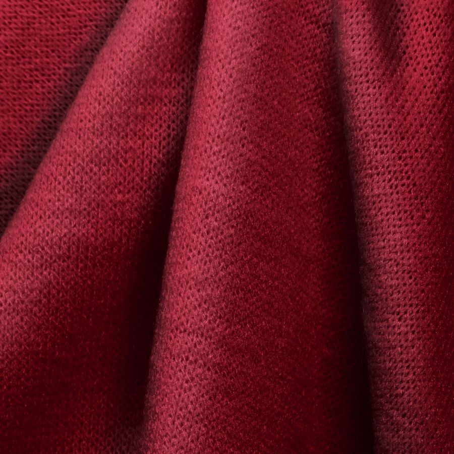 La tela base de este tejido se llama Punto Jersey de Tacto Algodón - Atenas, con un gramaje de 239 gr/m2 y una composición de 81% POLIÉSTER, 15% ACRÍLICO y 4% ELASTANO. La tela base tiene un ancho de 150 cm y es suave y elástica al tacto. El color liso impreso es de un Rojo Carmín intenso, con un contenido de CMYK de 26 100 91 28, lo que representa una alta presencia de magenta y amarillo.