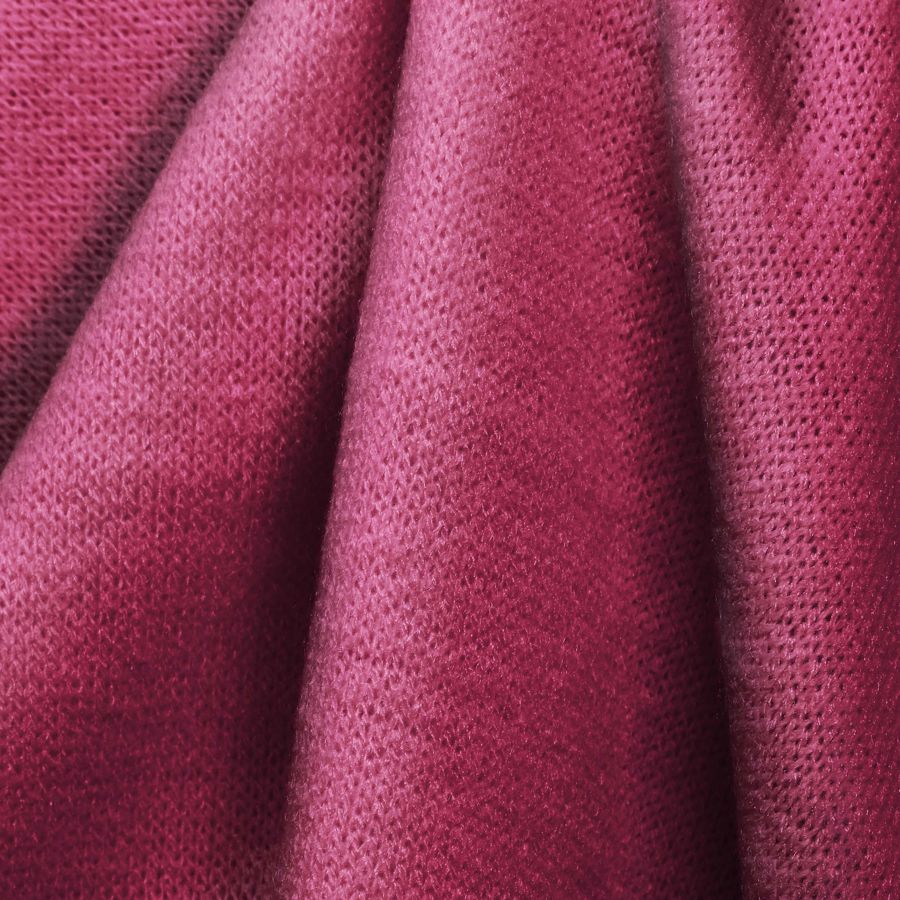La tela base es Punto Jersey de Tacto Algodón - Atenas de 239 gr/m2 con una composición de 81% POLIÉSTER, 15% ACRÍLICO y 4% ELASTANO. Su ancho es de 150 cm y se presenta en color liso impreso con tintas de CMYK 15 84 27 3, que dan como resultado un tono rosa bougainvillea. El color presenta una tonalidad intensa y vibrante gracias a las altas proporciones de magenta y a la presencia de un bajo porcentaje de tinta negra que eleva la saturación. Este color secundario puede combinarse con tonos neutros y pasteles claros para crear contrastes equilibrados o con tonos más brillantes como anaranjados y rojos para lograr un efecto llamativo y dinámico. Cabe mencionar que la tela se imprime a una sola cara por impresión digital textil, lo que significa que el estampado visible se encuentra únicamente en una de las caras del tejido.