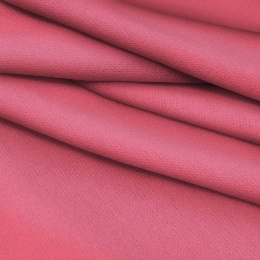 La tela base de este tejido es el Punto Jersey de Tacto Algodón - Atenas, compuesto por un 81% de poliéster, un 15% de acrílico y un 4% de elastano, siendo un tejido de punto de 239 gr/m2 y de 150 cm de ancho. El color liso impreso es un rosa mate con un CMYK de 0 74 36 0, lo que indica una alto nivel de magenta e importante presencia de amarillo. Este color secundario es audaz y vibrante, aportando un toque cálido y optimista al tejido. Por sus características, combina especialmente bien con colores neutros como el gris y el marrón y también con tonalidades verdes.