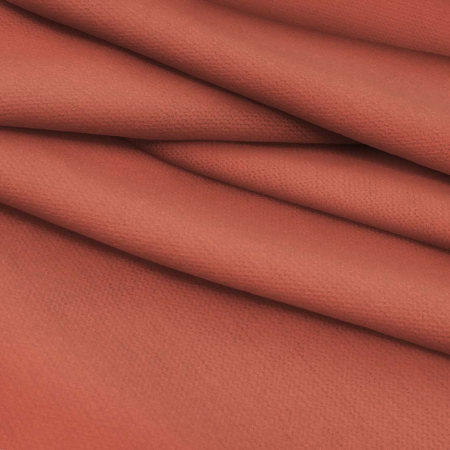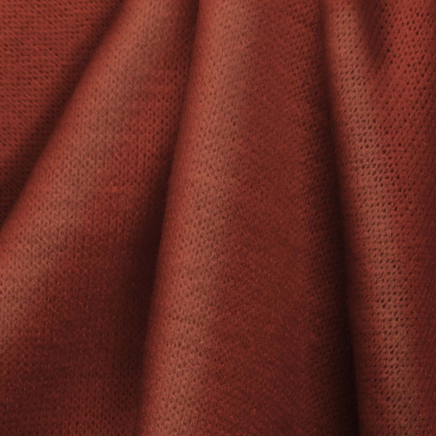 La tela base es el Punto Jersey de Tacto Algodón - Atenas, con una composición de 81% POLIÉSTER, 15% ACRÍLICO y 4% ELASTANO y un gramaje de 239 gr/m2. El color liso impreso es de un tono Marron Cedar Chest con un CMYK de 17 74 70 5. Este color simboliza la estabilidad y la armonía, se asocia con la tierra y la naturaleza, y se ajusta perfectamente a los tonos terracota y tostados. La tela está impresa con el color liso a una sola cara por impresión digital textil. La textura es suave y elástica.