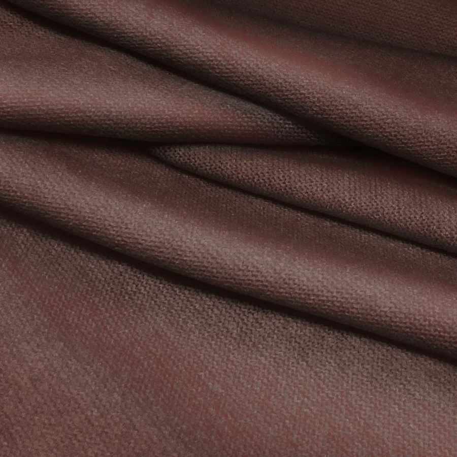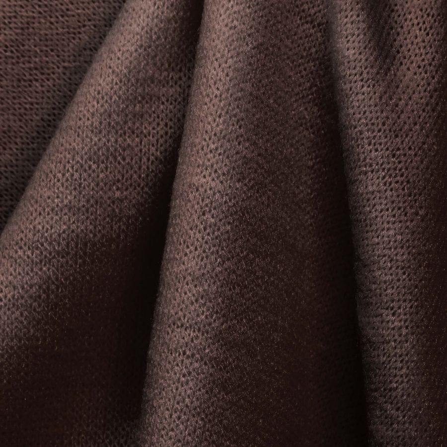La tela base, Punto Jersey de Tacto Algodón - Atenas, tiene una composición de 81% poliéster, 15% acrílico y 4% elastano, con un gramaje de 239 gr/m2 y un ancho de 150 cm. El color liso impreso, que se obtiene mediante una impresión digital textil de sublimación en poliéster, es un marrón madera caoba con un CMYK de 44 68 65 67. Este color representa la calidez de la madera y da sensación de confort. Combina de forma muy particular con tonos beige, crema, dorado y mostaza.