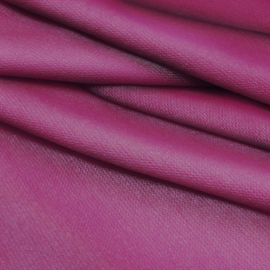 La tela base es el Punto Jersey de Tacto Algodón - Atenas, una tela de punto compuesta por un 81% de poliéster, un 15% de acrílico y un 4% de elastano con un gramaje de 239 gr/m2 y un ancho de 150 cm. El color liso impreso es de un tono morado, Boysemberry, con unas tintas de Cyan 44, Magenta 88, Yellow 29 y Black 21, representando un CMYK de 44 88 29 21. Este color secundario es vibrante y audaz, transmitiendo elegancia y estilo. Simbólicamente, el morado representa la creatividad, la estabilidad y la sofisticación.