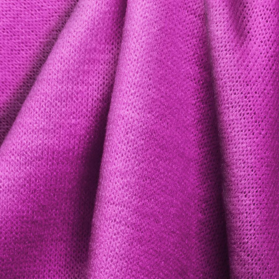 La tela base es el Punto Jersey de Tacto Algodón-Atenas, con una composición de 81% poliéster, 15% acrílico y 4% elastano. Su gramaje es de 239 gr/m2 y su ancho de 150 cm. El color liso impreso es de un morado con un dinamismo en tono purple, que se compone de una tinta cyan de 24, magenta de 72, yellow de 0 y black de 0, con un CMYK de 24 72 0 0. Este color transmite una sensación de calma y equilibrio, aportando serenidad y creatividad. Combina perfectamente con tonos pastel como el rosa ballerina o el amarillo limón.