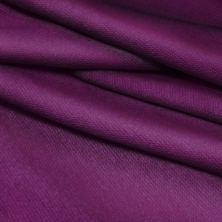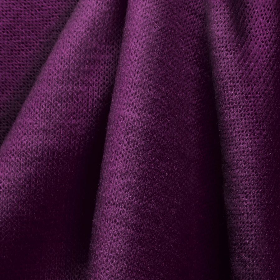 La tela base es el Punto Jersey de Tacto Algodón - Atenas, compuesta por 81% poliéster, 15% acrílico y 4% elastano, con un gramaje de 239 gr/m2 y un ancho de 150 cm. Su color liso impreso es Morado o Púrpura de Tiro, con un CMYK de 70, 100, 33, 47, lo que la hace intensa y vibrante. El color combina perfectamente con tonos grisáceos y azules, creando una combinación elegante y moderna. Es importante mencionar que la tela está impresa con el color liso a una sola cara por impresión digital textil, por lo que es importante considerarlo al momento de la creación de prendas.