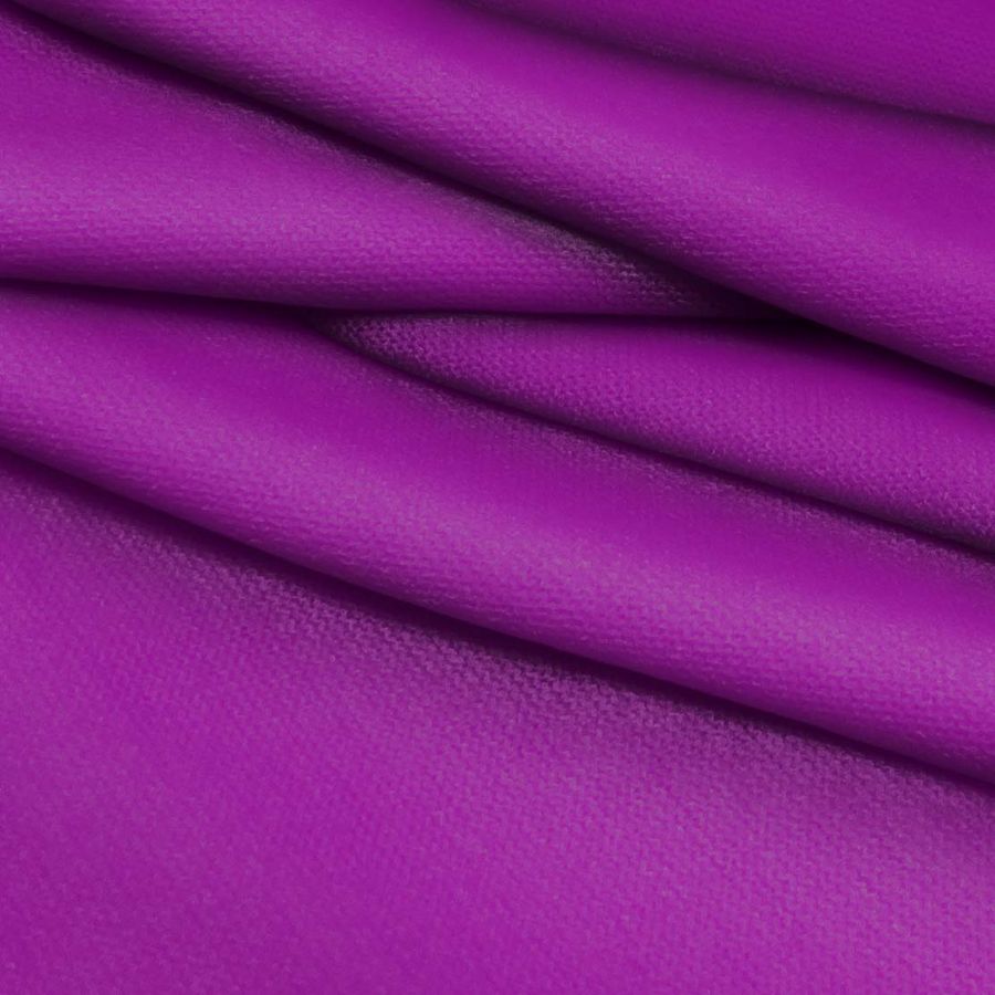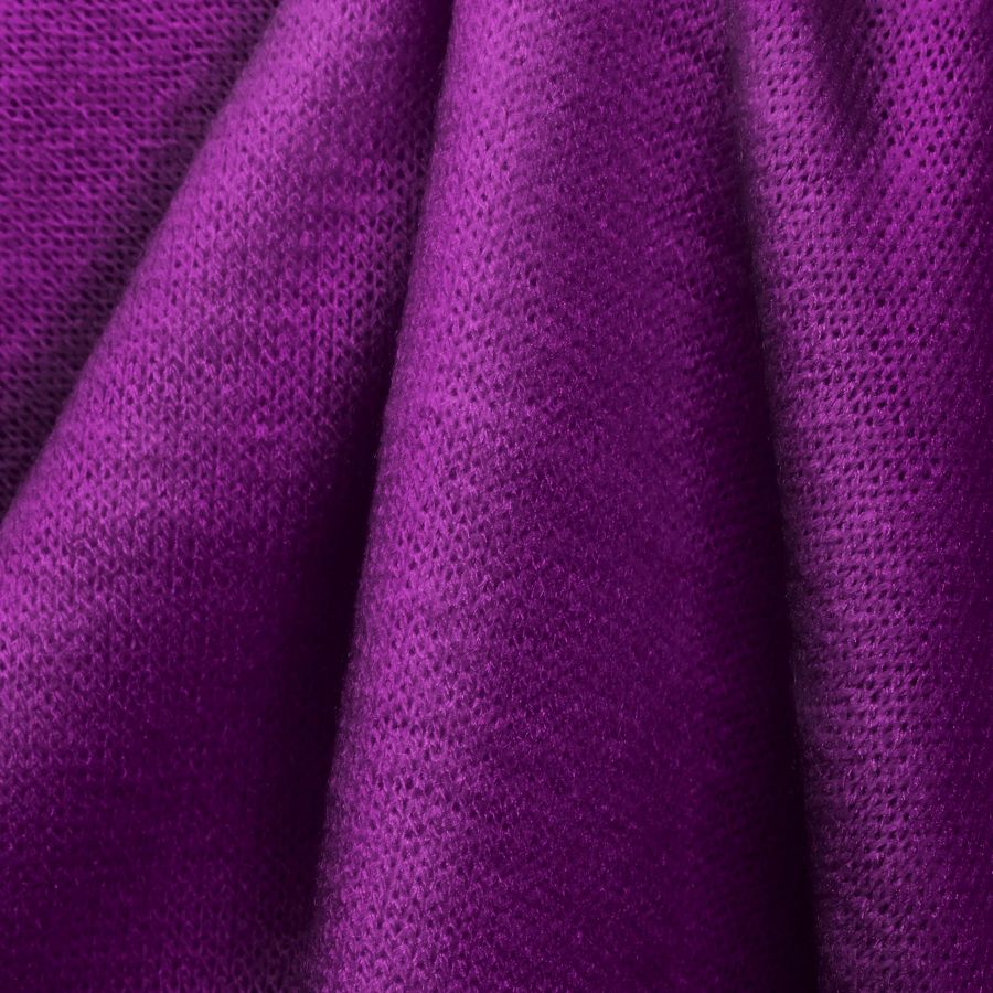 La tela base es Punto Jersey de Tacto Algodón - Atenas, compuesta por 81% POLIÉSTER, 15% ACRÍLICO y 4% ELASTANO, con un peso de 239 gr/m2 y un ancho de 150 cm. El color liso impreso es Morado-púrpura real, con un CMYK: 64 100 4 1. Este color es simbólicamente asociado al lujo, la creatividad y la sabiduría, y técnicamente describe una tonalidad ligeramente oscura y profunda con un toque de brillantez. Se combina bien con colores como el gris, el dorado y el beige, así como con tonos más vivos como el rosa y el naranja. La tela está impresa con el color liso a una sola cara mediante impresión digital textil, lo que significa que el tejido no está tintado en su totalidad, sino que se imprimió una capa de color en la superficie del tejido.