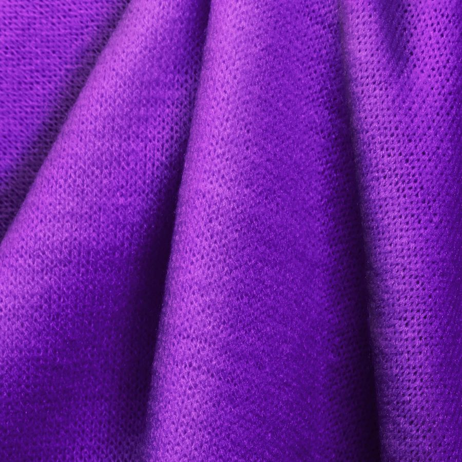La tela base del tejido es el Punto Jersey de Tacto Algodón - Atenas, compuesta por un 81% de poliéster, un 15% de acrílico y un 4% de elastano, con un gramaje de 239 gramos/m2 y un ancho de 150 cm. El color liso impreso es de un vibrante morado-purpura X 11, con un CMYK de 70 81 0 0. El color transmite una energía creativa y enérgica, y combina perfectamente con otros tonos fuertes como el azul eléctrico o el naranja.