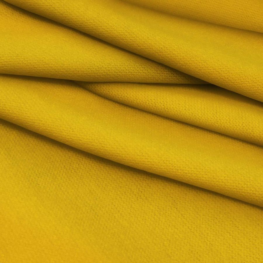 La tela base es el Punto Jersey de Tacto Algodón - Atenas, con una composición de 81% POLIÉSTER, 15% ACRÍLICO y 4% ELASTANO, un gramaje de 239 gr/m2 y un ancho de 150 cm. El color liso impreso es de un vibrante amarillo, que se asemeja al manto de la Jirafa, con un perfil de CMYK de 2, 36, 93 y 0. Además, el material posee una textura suave y elástica al tacto.