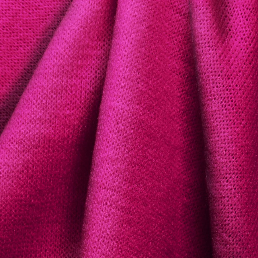 La tela base utilizada es el Punto Jersey de Tacto Algodón - Atenas, con una composición de 81% poliéster, 15% acrílico y 4% elastano. El color liso impreso es rojo con tonalidades púrpura, representado por el CMYK 2 98 10 0. Este color secundario simboliza la pasión y creatividad, con una profundidad y complejidad que lo hace interesante y atractivo. Combina perfectamente con colores neutros como el blanco, negro y gris, así como también con tonalidades suaves y cálidas, como el beige y amarillo.