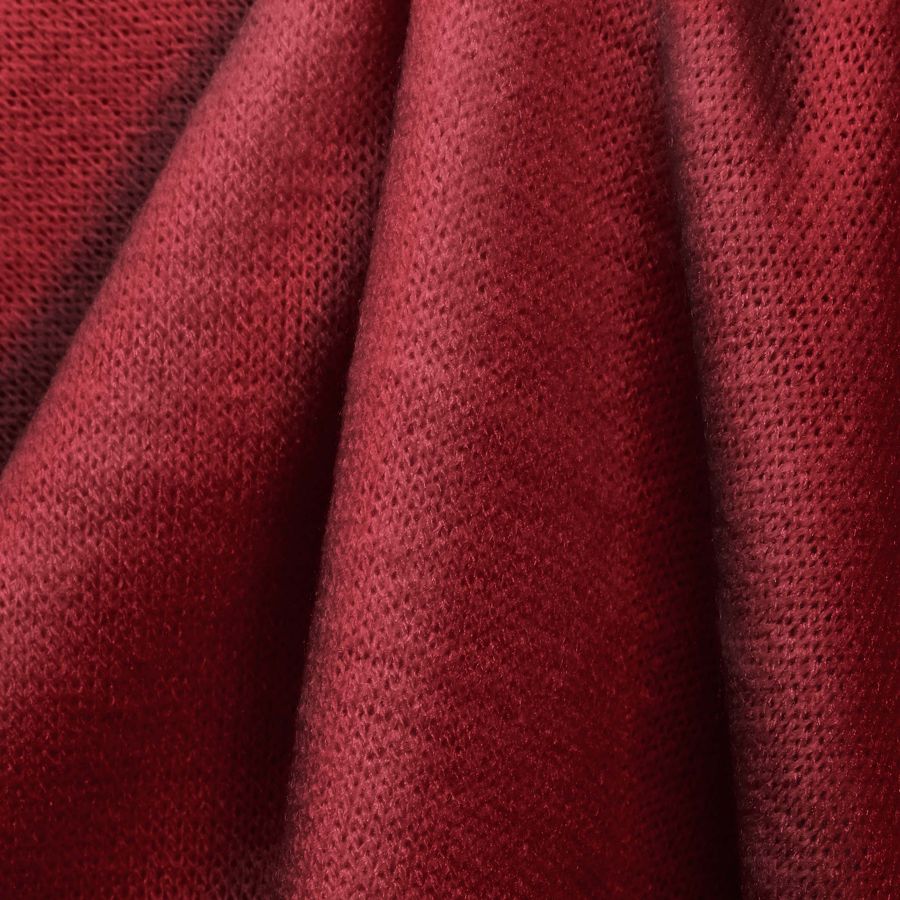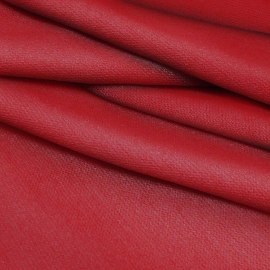 La tela base es el Punto Jersey de Tacto Algodón - Atenas, con una composición de 81% poliéster, 15% acrílico y 4% elastano, de 239 gr/m2 de gramaje y 150 cm de ancho. Su color liso impreso es un vibrante tono rubí, con una mezcla de tintas de 25 cian, 100 magenta, 89 amarillo y 24 negro, lo que refleja la profundidad y el brillo del color. Simbólicamente, el rojo simboliza la pasión y la energía, y técnicamente, su tonalidad en particular combina con colores como el negro, el gris, el blanco y el dorado. El tejido está impreso con el color liso a una sola cara por impresión digital textil, lo que permite una alta calidad de definición del diseño y colores vibrantes.