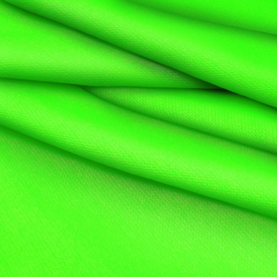 La tela base es el Punto Jersey de Tacto Algodón - Atenas, compuesta por un 81% de poliéster, un 15% de acrílico y un 4% de elastano, con un gramaje de 239 gr/m2 y un ancho de 150 cm. En cuanto a su color, se trata de un verde arlequín con CMYK (62, 0, 100, 0). Este color secundario es muy simbólico, ya que el verde representa la esperanza, la estabilidad y el equilibrio, mientras que el arlequín aporta un toque de alegría y diversión. Este color combina especialmente bien con tonos amarillos y grises. La tela está impresa con este color liso en una sola cara por impresión digital textil.