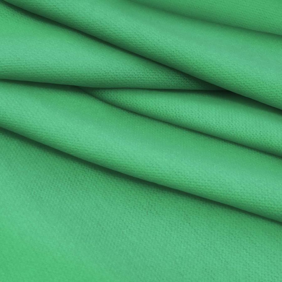 El tejido está impreso con el color liso a una sola cara por impresión digital textil, lo que significa que el color verde solo se encuentra en una cara del tejido, mientras que la otra cara permanece en su estado natural. La tela base es suave al tacto y elástica, lo que la hace idónea para prendas cómodas y ajustables al cuerpo. Además, su gramaje la hace adecuada para confeccionar prendas de punto gruesas y cálidas para el invierno y el otoño.