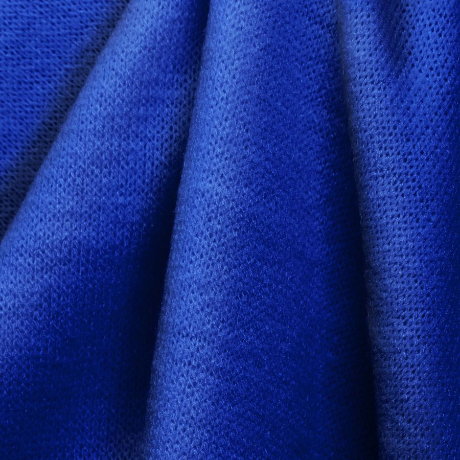 La tela base del producto es el Punto Jersey de Tacto Algodón - Atenas, con una composición del 81% de POLIÉSTER, 15% de ACRÍLICO y 4% de ELASTANO, con un gramaje de 239 gr/m2 y un ancho de 150 cm. El color liso impreso en la tela es el Azul Iris, con un CMYK de 95 77 0 0. Este color es un matiz sutil de azul que combina a la perfección con tonos como el gris claro, el beige y el blanco roto. La tela se imprime con el color liso a una sola cara mediante impresión digital textil.