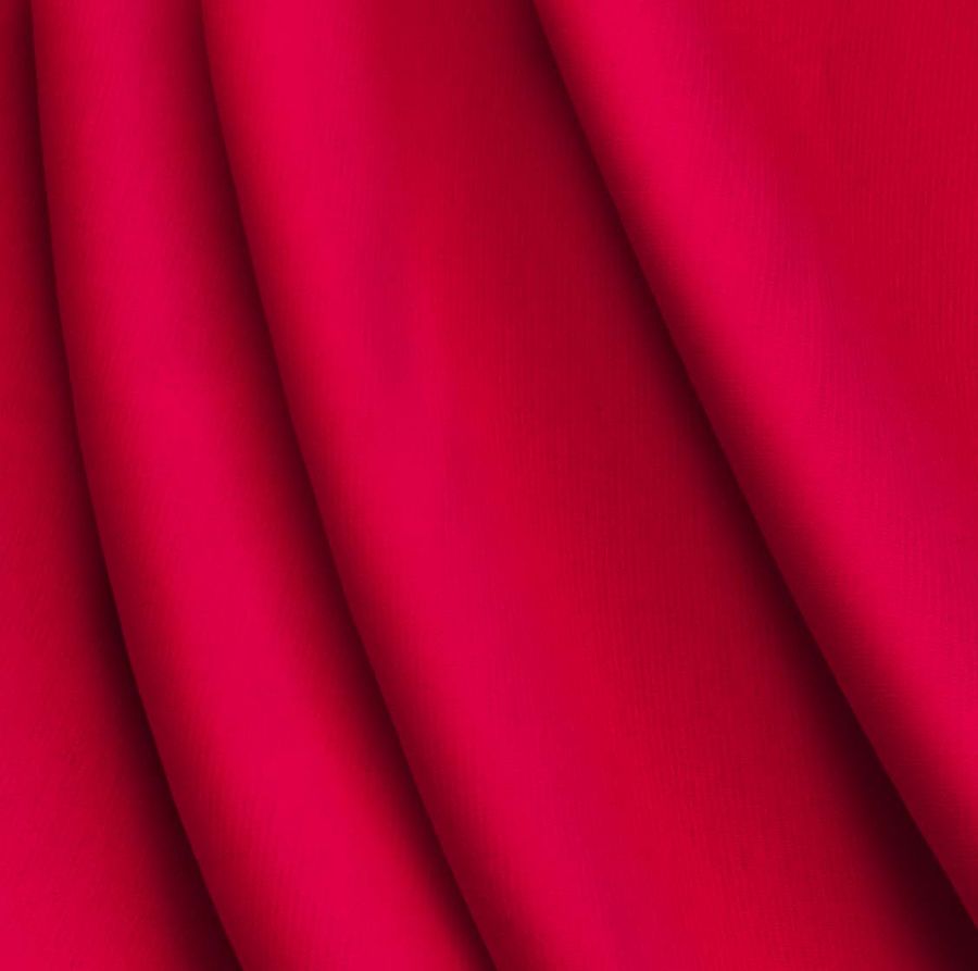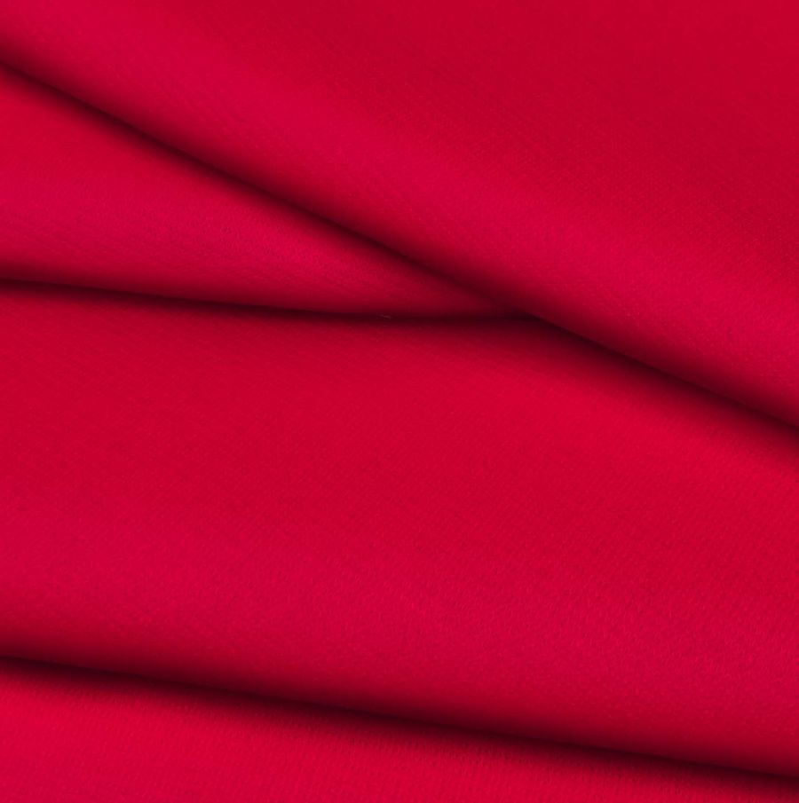 La tela base, Punto Roma Elástico - Lyon, es una tela de punto compuesta por un 97% de poliéster y un 3% de elastano con un gramaje de 282 gr/m2 y un ancho de 150 cm. El color liso impreso es un rojo carmín intenso con una paleta de colores en CMYK de 0 100 77 0. Este color secundario se puede combinar con tonos neutros para una apariencia más elegante y con tonos más vivos para un estilo más llamativo. La tela está impresa con el color liso a una sola cara por impresión digital textil, lo que significa que no es un tejido tintado sino impreso por una sola cara.