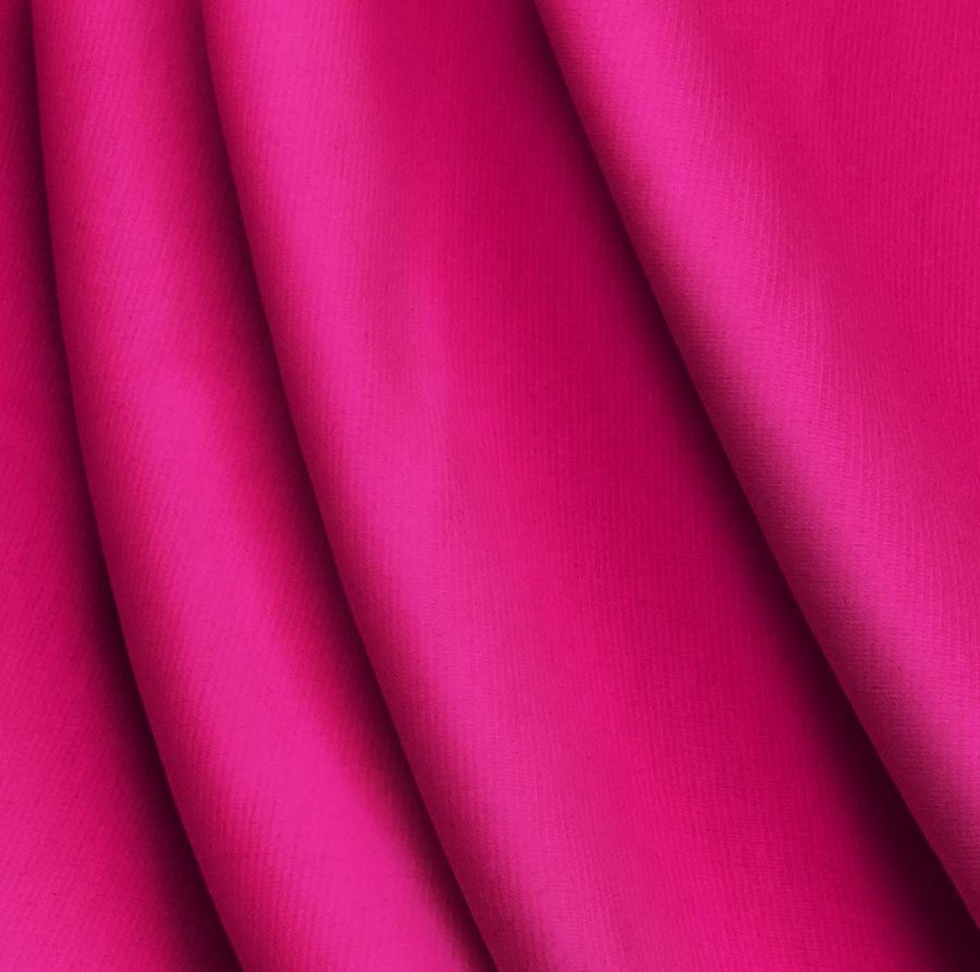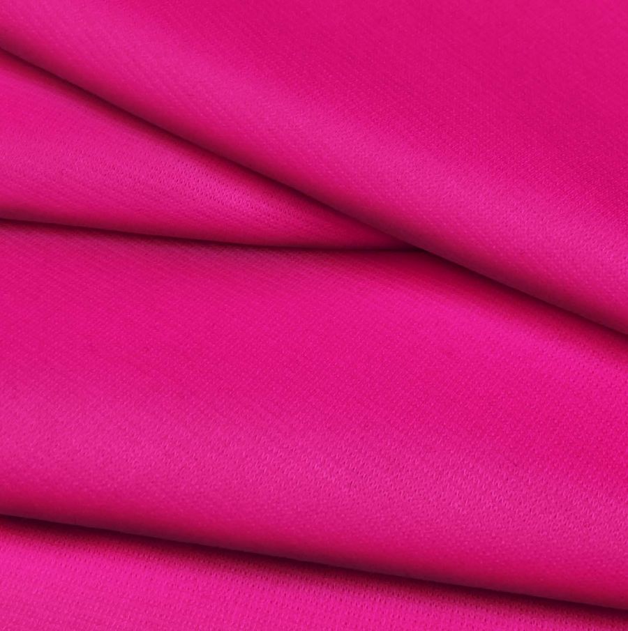 La tela base es el Punto Roma Elástico - Lyon, una tela de punto compuesta por un 97% de poliéster y un 3% de elastano, con un gramaje de 282 gr/m2 y un ancho de 150 cm. Presenta una textura suave y agradable al tacto. El color liso impreso es un rosa brillante, con un CMYK de 0 93 8 0, lo que indica una alta cantidad de magenta y un toque de amarillo. Este color puede combinarse con tonos neutros como el gris y el blanco, así como con tonos más saturados como el verde menta y el dorado.