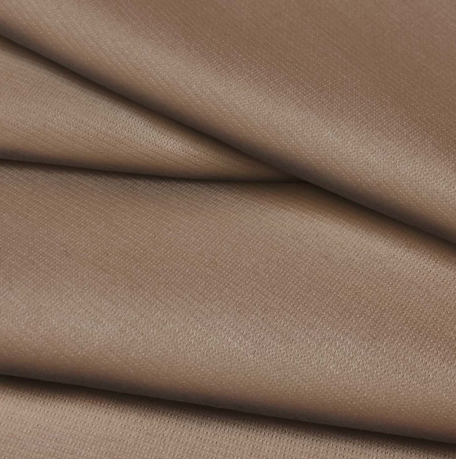 La tela base es Punto Roma Elástico - Lyon, una tela de punto compuesta por 97% poliéster y 3% elastano, con un gramaje de 282 gr/m2 y una anchura de 150 cm. El color liso impreso es marrón adobe, cuyo CMYK es 35 45 51 28, lo que significa que tiene un tono marrón oscuro y cálido con un ligero matiz rojizo. Este color se combina bien con otros tonos terrosos, como el beige, el caqui y el naranja quemado.