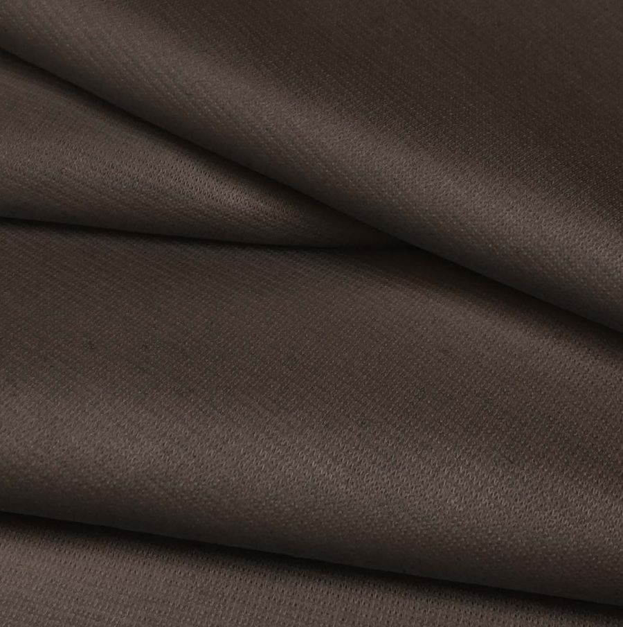 La tela base Punto Roma Elástico - Lyon presenta una composición de 97% poliéster y 3% elastano, con un gramaje de 282 gr/m2 y un ancho de 150 cm. El color liso impreso en este tejido es un marrón castaño oscuro, que se logra mediante una mezcla de tintas cian, magenta, amarilla y negra en los siguientes porcentajes: 56, 60, 65 y 70, respectivamente. Este color secundario tiene una carga simbólica de estabilidad, madurez y elegancia, combinando perfectamente con tonos marrones más claros, beige, blanco, gris oscuro, dorado y burdeos.
