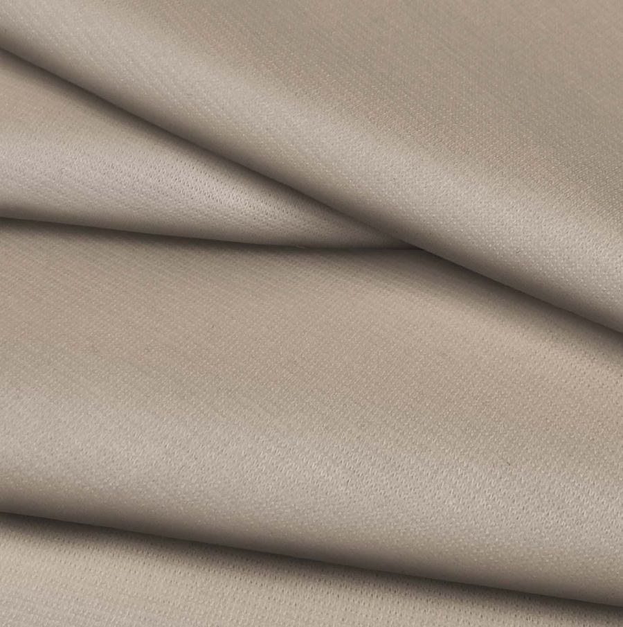La tela base es de Punto Roma Elástico - Lyon, con una composición de 97% poliéster y 3% elastano. Su gramaje es de 282 gr/m2 y cuenta con un ancho de 150 cm. El color liso impreso es de un marrón pálido, cuya tonalidad se obtiene de una combinación de tintas Cyan, Magenta, Yellow y Black, en una proporción de 25-29-38-8 respectivamente. Este color, que es suave y agradable al tacto, se combina perfectamente con colores como el blanco, el crudo o el negro.