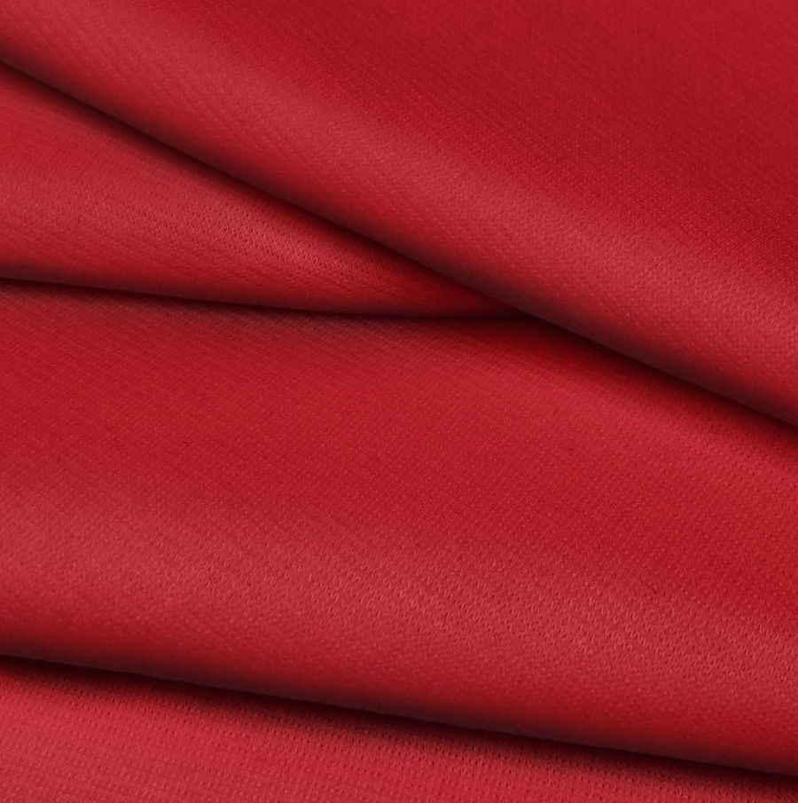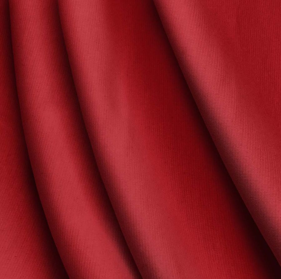 La tela base es el Punto Roma Elástico - Lyon, una tela de punto compuesta por un 97% de poliéster y un 3% de elastano, con un gramaje de 282 gr/m2 y una anchura de 150 cm. El color liso impreso en esta tela es el Granero Rojo, con un CMYK de 20 100 95 13, lo que le da una tonalidad roja intensa y profunda.