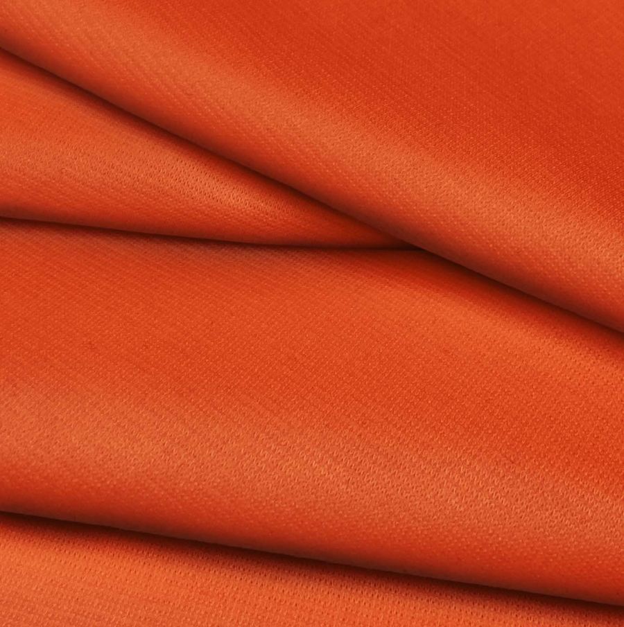 La tela base de este tejido es el Punto Roma Elástico - Lyon, compuesto por 97% de poliéster y 3% de elastano, con un gramaje de 282 gr/m2 y un ancho de 150 cm. El color liso impreso es un naranja puro, con una tinta cyan de 0, magenta de 82, yellow de 94 y black de 0, lo que representa un CMYK de 0 82 94 0. Este color se caracteriza por ser alegre y vibrante, evocando la energía y vitalidad del verano. Combina particularmente bien con colores secundarios como el verde oliva, azul turquesa y magenta.