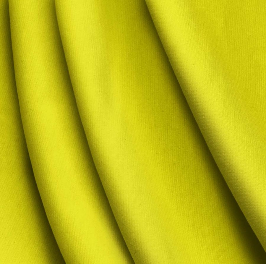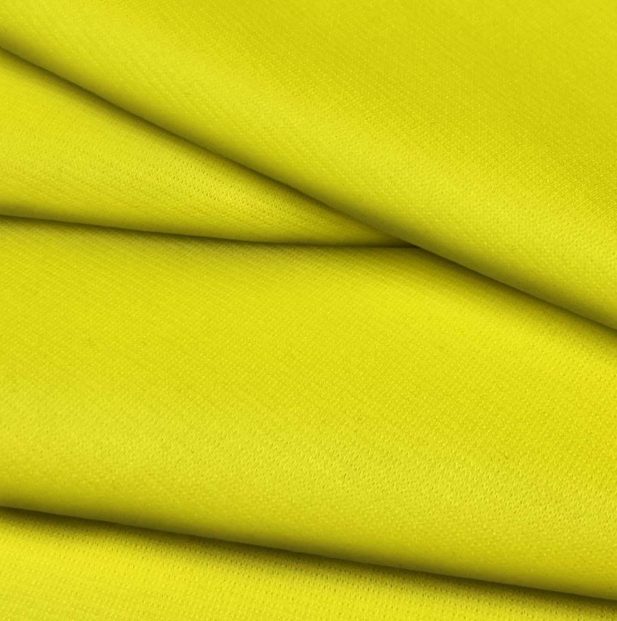 La tela base es el Punto Roma Elástico - Lyon, una tela de punto compuesta por un 97% de poliéster y un 3% de elastano, con un gramaje de 282 gr/m2 y un ancho de 150 cm. El color liso impreso es un amarillo cadmio intenso, con un porcentaje de tinta cyan del 8, un porcentaje de tinta magenta del 0, un porcentaje de tinta yellow del 88 y un porcentaje de tinta black del 0, dando como resultado un CMYK de 8 0 88 0.