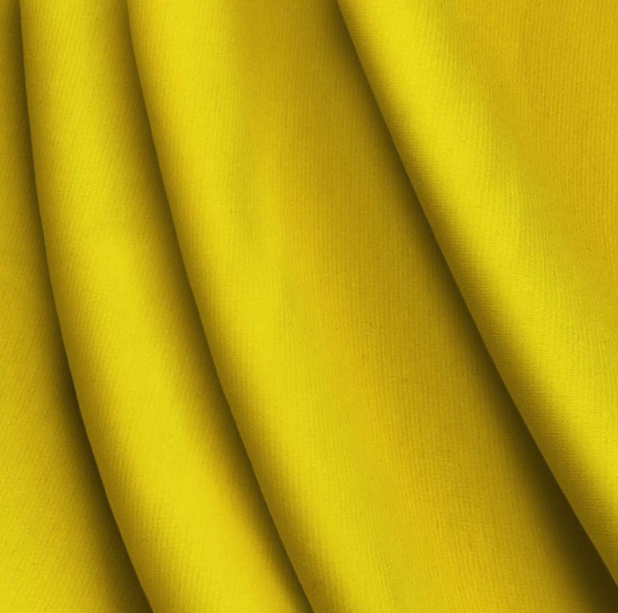 La tela base de esta descripción es el Punto Roma Elástico - Lyon, una tela de punto compuesta por un 97% de poliéster y un 3% de elastano, con un gramaje de 282 gr/m2 y un ancho de 150 cm. Su cuidado debe ser lavar a una temperatura máxima de 30ºC, no usar blanqueador, admitir limpieza en seco salvo tricloroetileno, planchar a temperatura fría y no usar secadora. La temporada recomendada para esta tela es invierno. El color liso impreso es amarillo cromo, con un CMYK de 0 21 91 0.