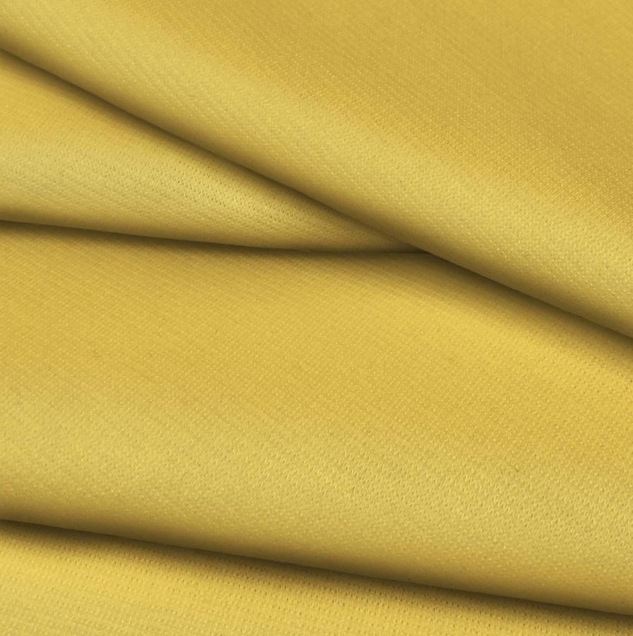 La tela base es Punto Roma Elástico - Lyon, una tela de punto con un alto contenido de poliéster y elastano que le otorgan una gran elasticidad y comodidad al llevarla puesta. El color liso impreso es Amarillo LLama, un tono cálido y vibrante que se corresponde con un CMYK 0 21 74 0. Este color, al ser secundario, se obtiene mediante la mezcla de magenta y amarillo, y se puede combinar muy bien con tonos verdes, azules o grises.
