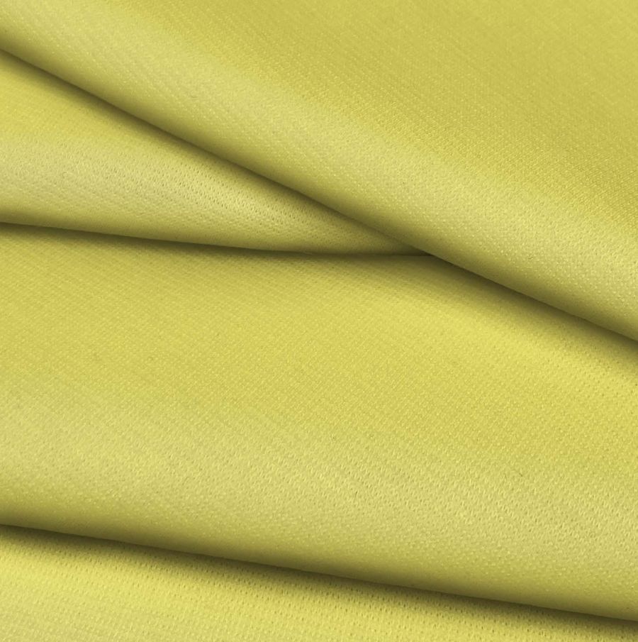 La tela base de este tejido es un punto roma elástico conocido como Lyon, que está compuesto principalmente por poliéster y elastano, lo que le da una alta resistencia y elasticidad. En cuanto a su color, el liso impreso se presenta en un amarillo níquel-titanio cuyo CMYK es 5 0 70 0. Este color se caracteriza por ser relajante y sofisticado, ideal para prendas invernales. Además, combina perfectamente con tonos grises, verdes e incluso, rojos.