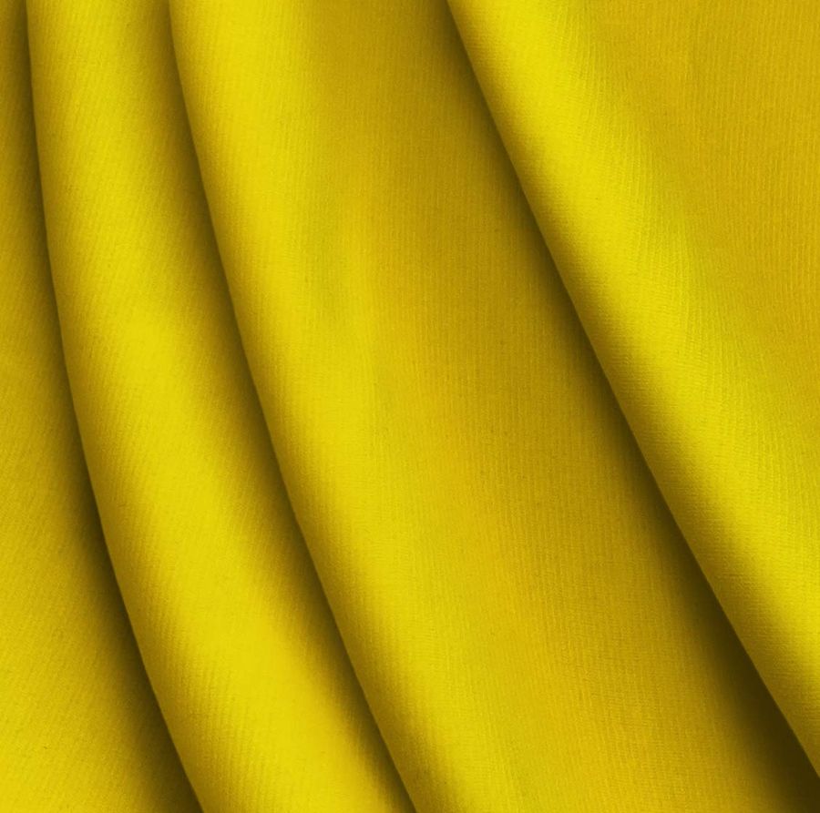 La tela base es el Punto Roma Elástico - Lyon, una tela de punto compuesta por 97% poliéster y 3% elastano con un gramaje de 282 gr/m2 y ancho de 150 cm. Su color liso impreso es Amarillo Primario, con un CMYK de 1 24 93 0, lo que indica una presencia muy alta de tinta amarilla en la impresión, junto con pequeñas cantidades de tinta magenta y cian, sin presencia de tinta negra. El amarillo es un color cálido y luminoso que evoca la alegría, la creatividad y la energía.